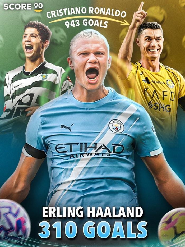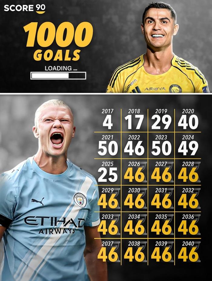 直播吧09月11日讯 据外媒Score90统计,哈兰德职业生涯目前已经打进了310球,如果他想达成C罗正在追求的生涯1000球里程碑,他需要从明年开始到2040年每年都打进46球。